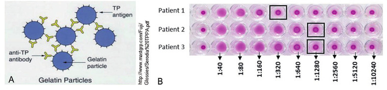 Abb. 1 Funktionsweise des TPPA (A) und Beispiele aus dem Laboralltag (B). (A) Auf Gelatinepartikel aufgebrachte Treponemenantigene binden die bei be- stehender oder durchgemachter Infektion im Patientenblut vorhandenen Antikörper und agglutinieren. (B) Bei Agglutination bilden die Gelatinepartikel einen Teppich, wie bspw. bei dem Titer 1:40 der Patienten 1-3. Wenn keine treponemenspezifischen Antikörper im Patientenblut enthalten sind, sammeln sich die Gelatine- partikel am Boden des Reagenzgefäßes, wie bei dem Titer 1:10240 aller drei Patienten.