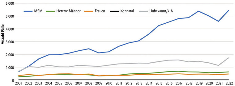 Abb. 2 Anzahl gemeldeter Syphilis-Infektionen nach wahrscheinlichem Infektionsweg. Deutschland, IfSG- Meldezahlen 2001 – 2022 (n = 116.529). MSM = Männer, die Sex mit Männern haben; k. A. = keine Angabe