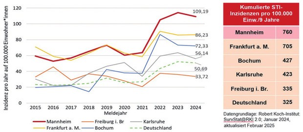 Mannheim weist für 2015-2024 eine kumulative 9-Jahres-Inzidenz der meldepflichtigen STI HIV, Hepatitis B, Hepatitis C und Syphilis von 760/100.000 Einwohner auf. Es liegt damit vor den Fast-Track Cities Frankfurt mit 705 und Bochum mit 427/100.000. Bei den HIV-Infektionen sind die Inzidenzen in Frankfurt und Mannheim ähnlich (87 vs. 82/100.000). Vor allem aber für Hepatitis B- und C-Infektionen liegen die Mannheimer Inzidenzen höher, für Hepatitis B bei 244/100.000 vs. 225 in Frankfurt und 182/100.000 in Bochum und für Hepatitis C bei 231 vs. 105 in Frankfurt und 99/100.000 in Bochum. Seit 2021 wird ein Anstieg der Hepatitis B- und C-Meldungen sowohl in Mannheim als auch bundesweit vor allem in Großstädten beobachtet. Die Ursachen hierfür sind unklar. Zum Anstieg der Mannheimer Hepatitis B- und C-Inzidenzen laufen aktuell Untersuchungen. (Abb. 1)